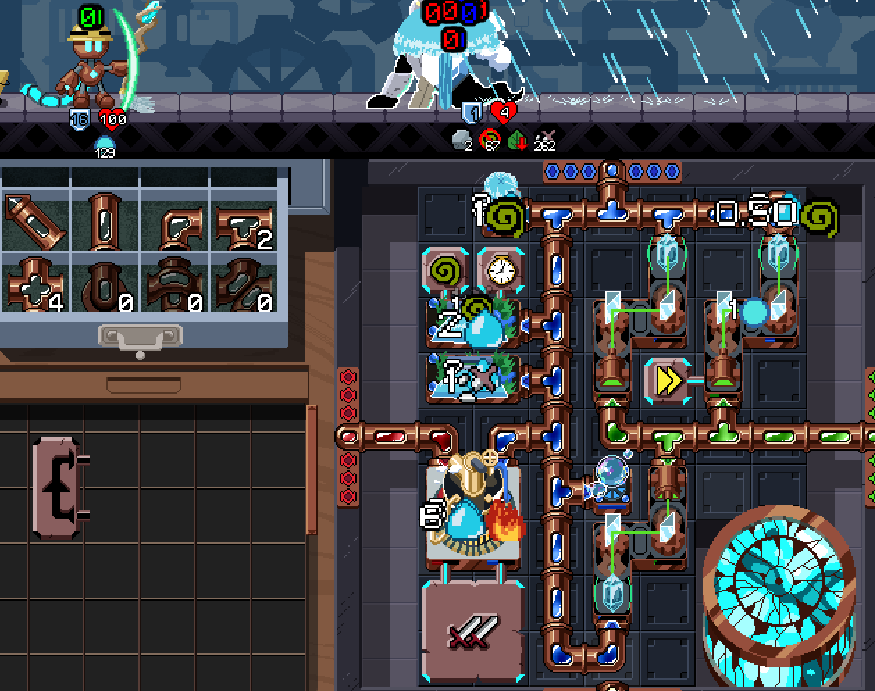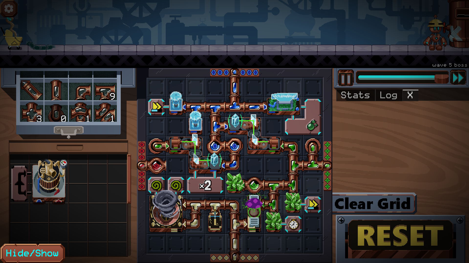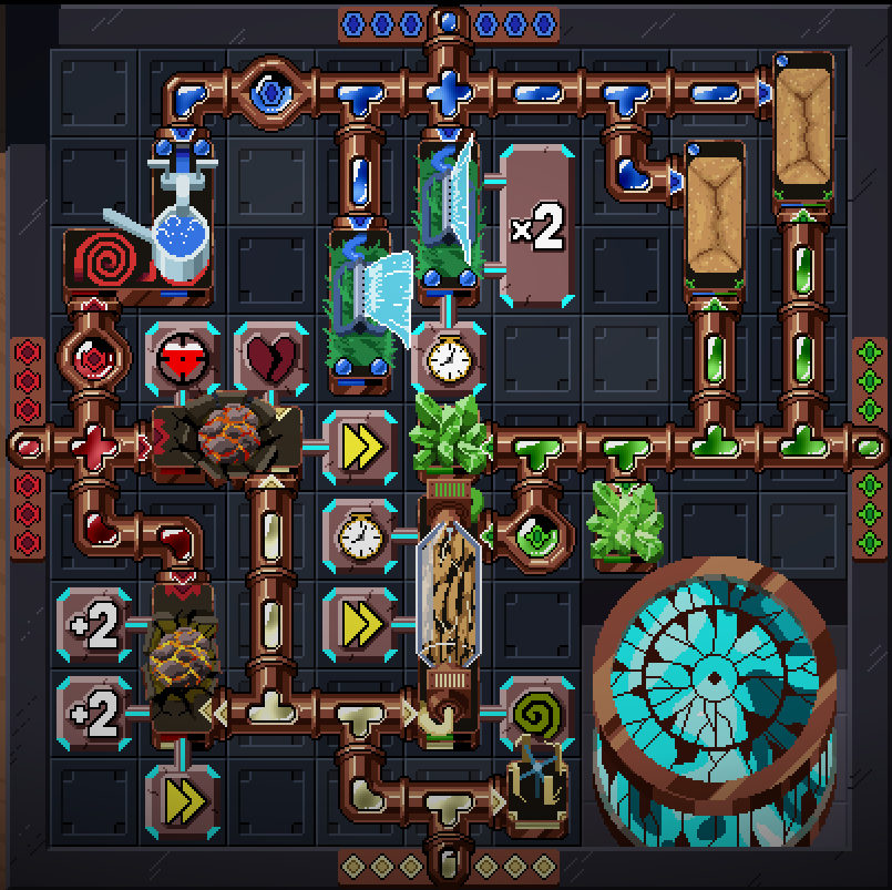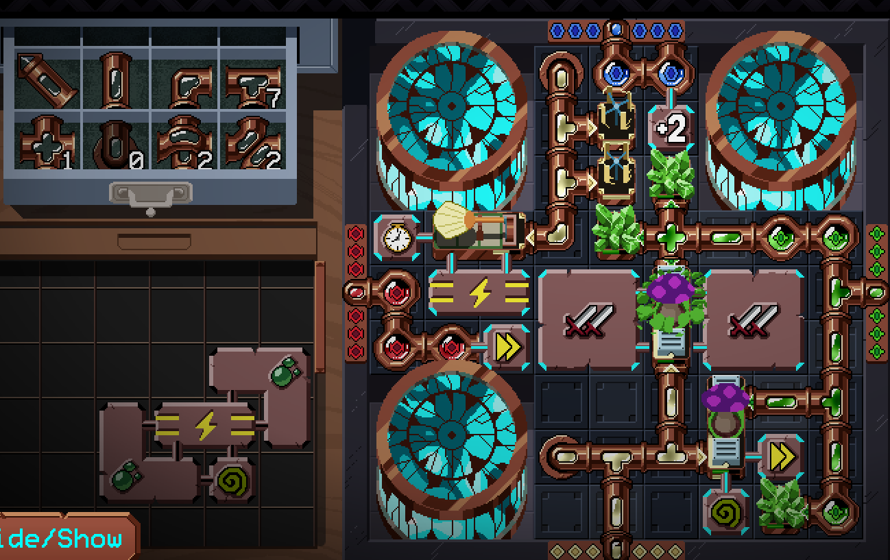 Played over on Steam and left my review there, I absolutely love this game!! The animation work for all of the tiles is wonderful, I appreciate the different visuals to match powered/unpowered states. Controls for tile placement and management are genuinely very intuitive, although I would've liked to be able to right click + drag to remove pipes in a similar style to pencil placement. I like how each element's spell tiles follow some general theme in terms of function, making each color represent a literal "element" of a good build; Adjusting for where my build was lacking felt so natural when you can plainly see which elements are less developed than others on the grid.